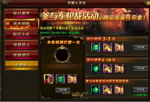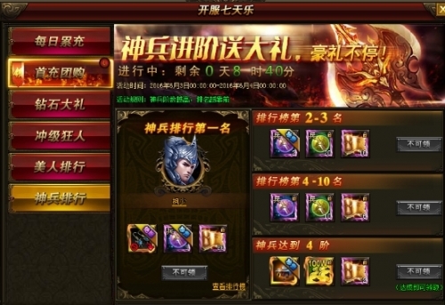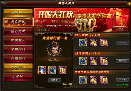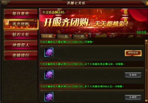 活动说明:开服前7天,每天全服首充人数达到10/20/50人,可领取奖励,个人充值任意金额以及达到388元宝更可领取大奖