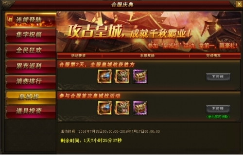 活动内容:合服后只有第二天才开放皇城战,活动过后胜方和败方都可领取到额外的奖励(活动结束后即可领取)