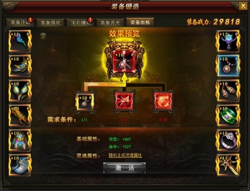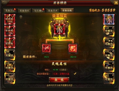 5、红装激活后可以继续对装备进行血炼,血炼可以改变当前的红装的灵魂属性类型