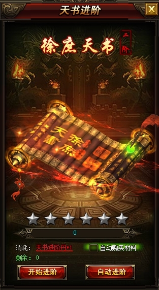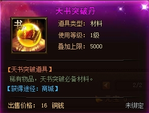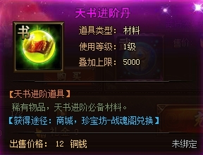 天书进阶消耗“天书进阶丹”增加进阶值(天书等阶越高材料消耗数量越多)。