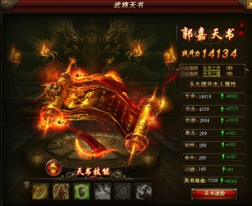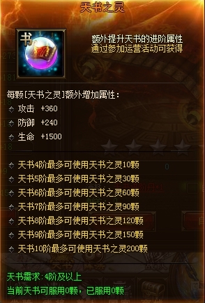 【天书之灵】每颗额外增加属性:攻击360防御+240生命+1500