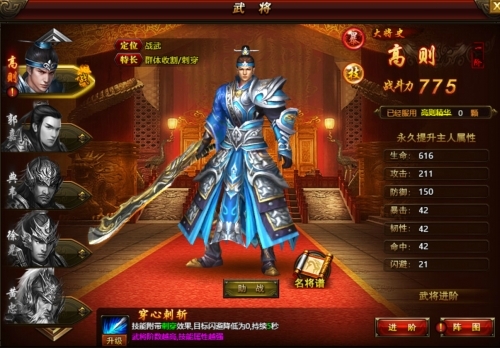 技能:穿心刺斩。出战或助战时主人可使用。技能福袋刺穿效果,目标闪避降低为0,持续5秒。武将阶数越高,技能属性越强。