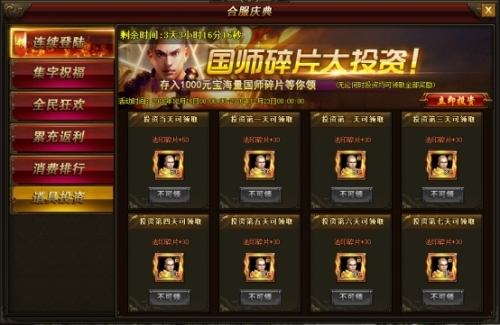 *玩家无论何日开始投资都可领取7天奖励(合服活动结束后通过每日登录时的领取界面发送)